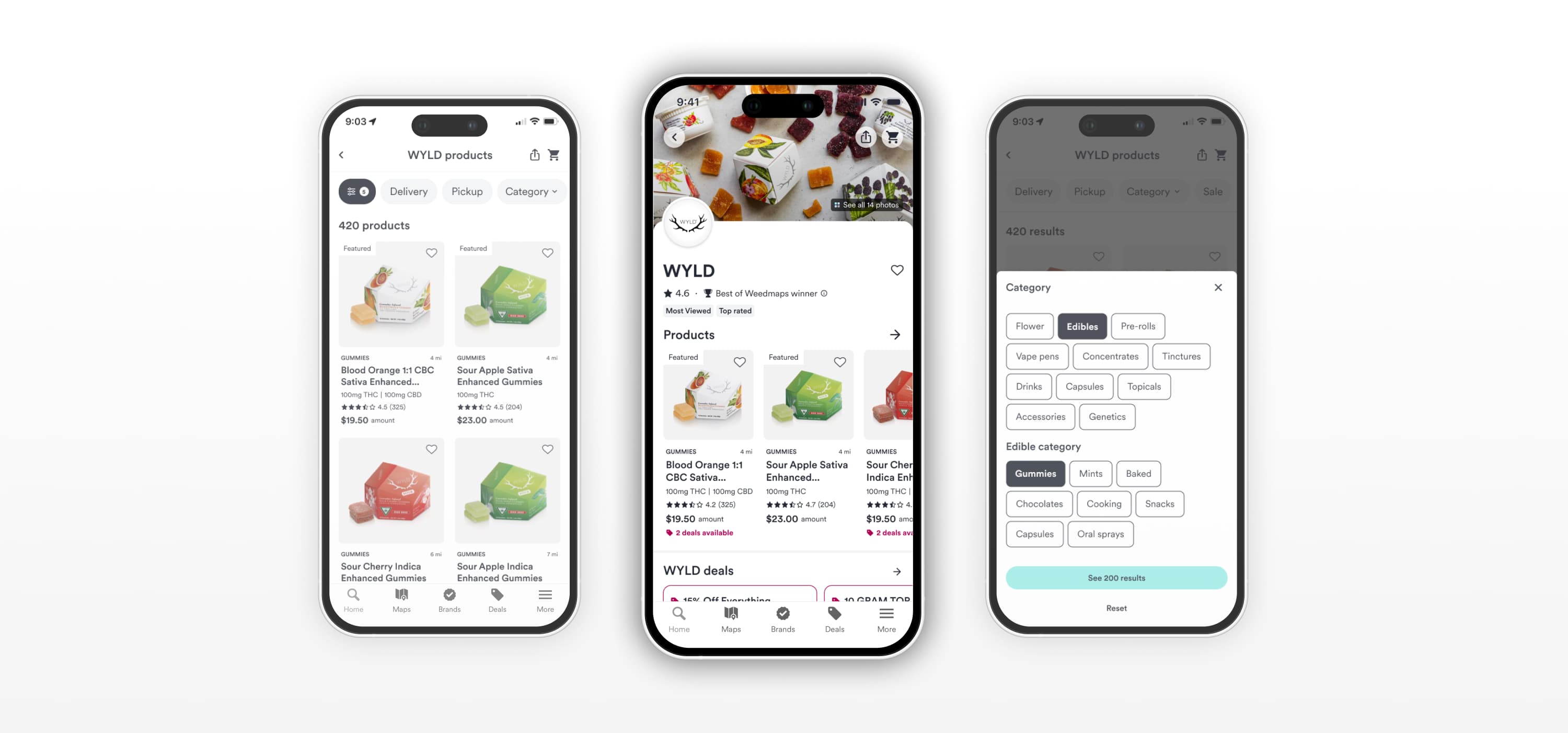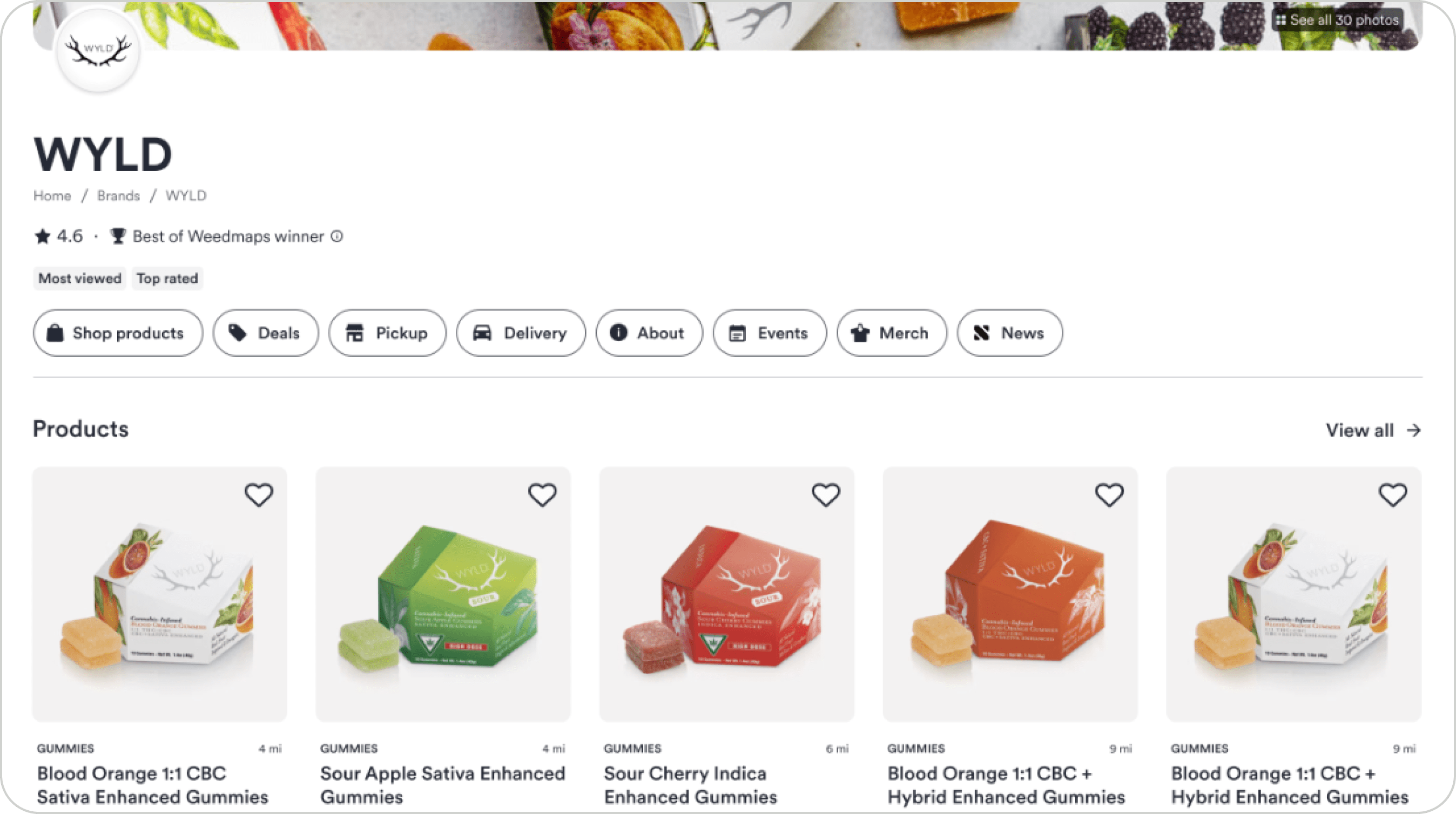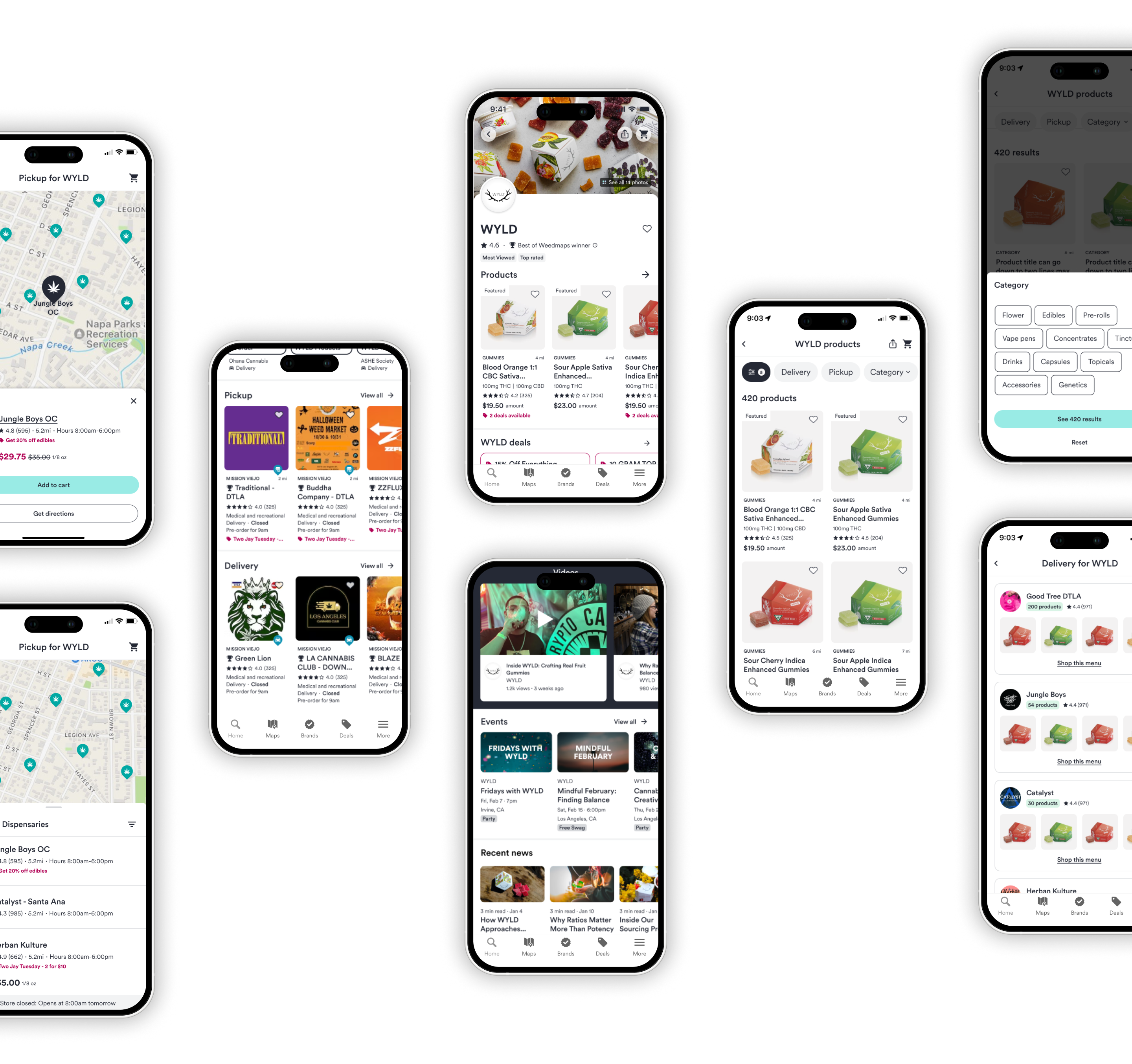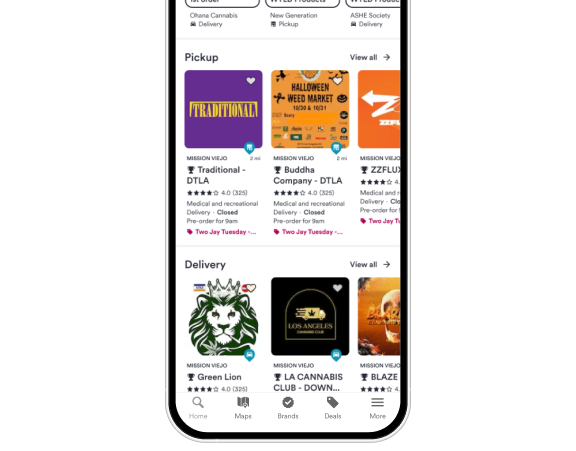 Users can explore nearby dispensaries carrying the brand through an interactive map and filtered retailer lists. Delivery and pickup options are clearly separated to support different fulfillment preferences.